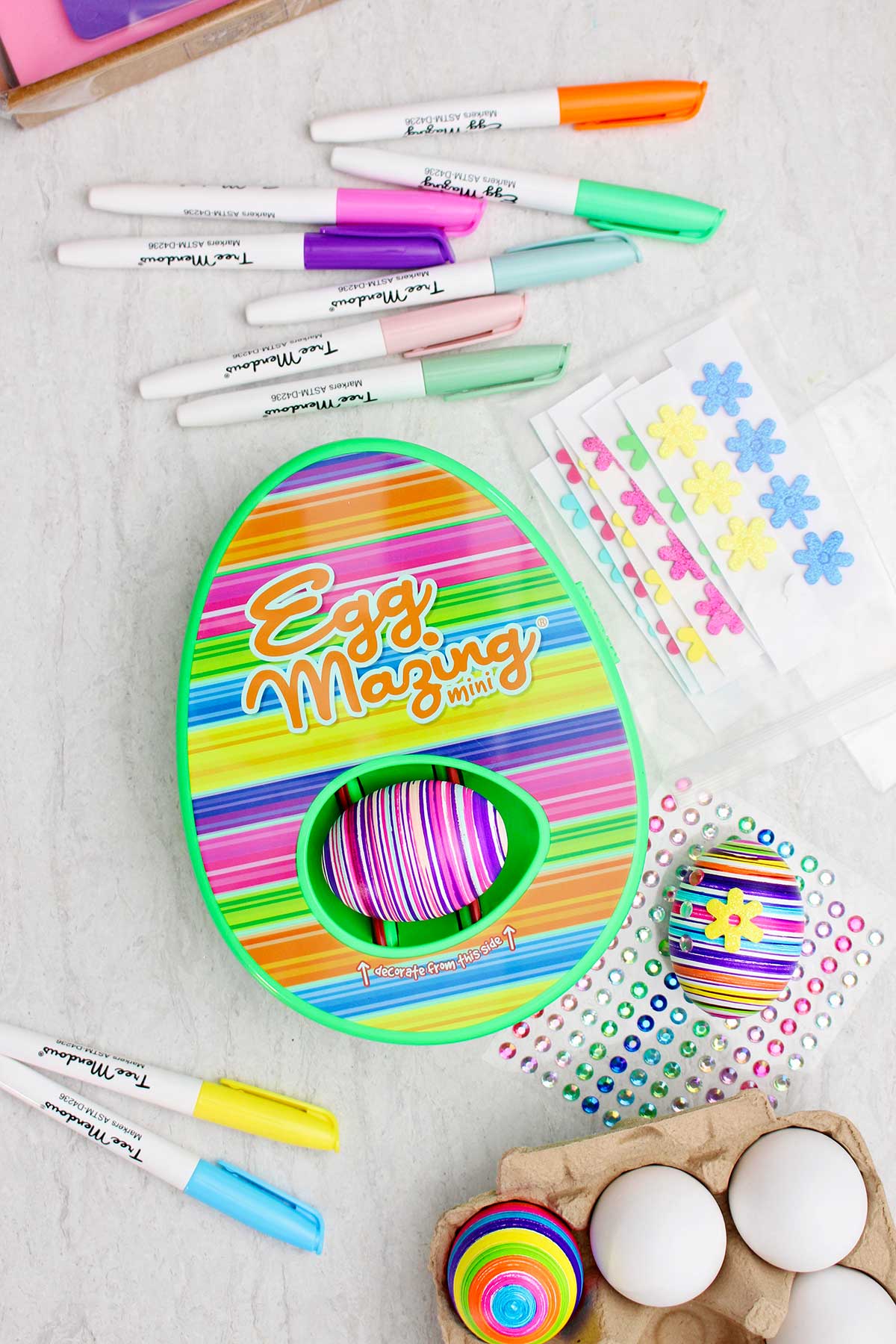 - EggMazing Egg-cessory Pack (optional) we had this kit (with jewels, foam letters and shapes, 3 additional quick drying pens) but you could use your own craft supplies to decorate the eggs.